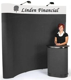 This exhibition booth, also known as a popup display, offers an easy, customizable solution to your trade show display needs! The unit is sure to turn passersby into potential clients. This exhibition booth features an 8′ curved frame that is covered in black hook and loop receptive fabric panels. Users can attach any combination of accessories with the hook and loop fasteners. This exhibition booth only requires advertisers to press the signs and accessories to the fabric. The showcase is ideal for fast signage changes. This exhibition booth also offers a portable, easy to use design that sets up in minutes. Simply raise the frame from the ground and magnetic connectors will automatically snap it into place. Black fabric panels on this exhibition booth then attach to magnetic channels bars along the frame for a seamless look. A white vinyl header that can be printed with 1 or 2 colors runs across the top of the item. Please review the exhibition booth artwork requirements before ordering. For text only headers, specify text and color(s) in the “Special Notes” section of our order form. Logos can be up to 70″w x 11″h.