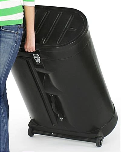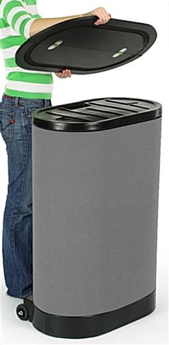 We sell this popup display with a molded, hard plastic carrying case that features wheels and safety latches. As an added bonus, this deluxe travel case converts into a trade show counter that can be used to address customers, display catalogs, or demonstrate products. This popup display also includes a matching gray wrap-around fabric panel and laminate countertop as part of the conversion kit. This coordinating look will add a look of class to your overall booth design. The fabric panels are made of hook-and-loop materials to match the popup display and give your booth a unified look. This entire booth system is ideal for novice exhibitors that don’t want to make a huge initial investment in custom printed graphics. Also included with this popup display are two halogen spotlights that attach to the frame for added impact. A foam-padded compartment in the case keeps these lights from breaking during transportation and storage.