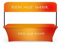 This promotional table that folds open sets up quickly. The covers also feature a zipper for easy storage access located underneath the counter. This exhibition counter, promotional table, has between a 24″ and 48-1/2″ gap between the surface and the bottom of the header, leaving plenty of space for trade show employees to work and engage visitors while promoting with the graphic covers. With the full bleed printing feature, companies are able to showcase their name, slogan or other marketing material. This promotional table is ideal for businesses and companies looking to stand out at exhibitions.