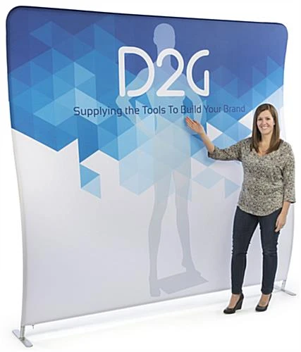 This double sided 8’ wide wave backdrop comes with a custom designed graphic, digitally printed in full color on a double sided stretch fabric cover. Customers can customize the fabric with their choice of promotional graphics for use at a trade show or marketing event. Each lightweight backdrop is quick and easy to assemble and disassemble. Highly portable, this curved display frame is constructed of lightweight aluminum tubing. Transport the backdrop from one trade show to another using the included canvas carrying tote. Each fabric cover is machine washable in cold water.
