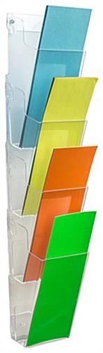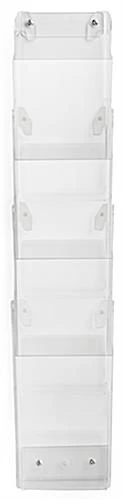 This hanging brochure holder is crafted from durable, clear acrylic. Leaflet dispensers are great for businesses such as travel agencies and car dealerships, but they also make great additions to community centers and health clubs. Each wall mounted brochure holder includes (4) clear pockets with pre-drilled holes and a metal bracket. Acrylic leaflet dispensers are great marketing tools for any business. A wall mounted display saves space and provides an organized, stylish display that’s sure to catch the eye of customers and potential clients. Use the brochure holder in office lobbies, at point of sale locations, and more!