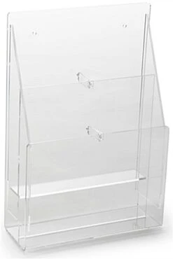 Brochure Racks – A versatile, upscale unit that can be used as a countertop or wall mount piece to display your information. As a dual option holder, it has sturdy, removable peg dividers to configure the pockets for either 4″ brochures (4 1/8″ max width) or 8 1/2″ wide magazines or packets (8 5/8″ max width). Simply snap-in or snap-out the dividers to reconfigure the pockets. Overall dimensions: 9-1/4″wide by3-1/2″ deep with a 13-3/4″ high back wall. Front wall of display is 7″ high. Pockets are 2″ deep. The back compartment is tiered up 2 3/4″ over the front compartment. Wall mounting hardware and extra pegs are supplied. Single sheets or papers will not stay upright in this magazine display rack.