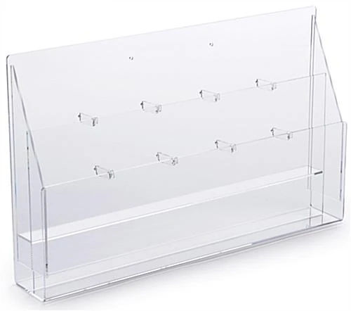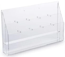 Lucite Brochure Holder – A versatile, upscale unit that can be used as a countertop or wall mount piece to display your information. As a dual option holder, it has sturdy, removable peg dividers to configure the pockets for either 4″ brochures (4 1/8″ max width) or 8 1/2″ wide magazines or packets (8 5/8″ max width). Simply snap-in or snap-out the dividers to reconfigure the pockets. Overall dimensions: 23″wide by 4 3/4″ deep with a 13 3/4″ high back wall. Front wall of display is 7″ high. Pockets are 1-1/2″ deep. The back compartment is tiered up 2 3/4″ over the front compartment. Wall mounting hardware and extra pegs are supplied. Single sheets or papers will not stay upright in this magazine display rack.