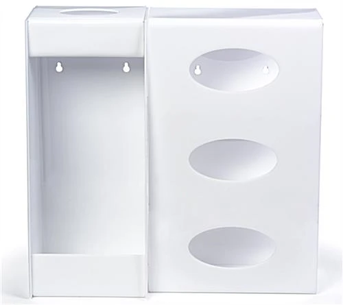 This wall mounted hygiene supply station provides easy access to essential personal protective equipment in exam rooms, medical labs, radiology rooms, and testing areas. This dispenser features an area for cleaning wipes, a 3.5″ wide holder for a hand sanitizer bottle, and three compartments for 9″ wide boxes of latex gloves. Our acrylic wall mounted hygiene supply station is also perfect for restaurant take-out areas where employees need to swap PPE in between orders and sanitizing work surfaces.