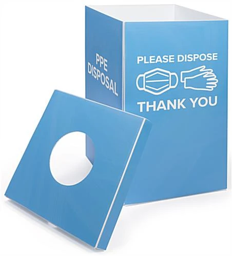 This PPE corrugated plastic trash bin is a great way to encourage patrons to your establishment to discard disposable gloves and masks properly. This corrugated plastic 40-gallon container features blue and white PPE pre-printed graphics to direct customers to this waste station. The lightweight construction of this PPE corrugated plastic trash bin makes it easy to move from one location to another. As the use of masks and gloves increases to protect against the spread of infectious germs, these disposable items are increasingly littering the grounds of retail stores and parking lots. Made for either indoor or outdoor placement, this waste container is an economical and convenient choice. Equip your facility with this pre-printed graphic corrugated plastic trash bin and do your part to encourage individuals to help themselves and others.