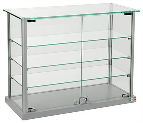 This aluminum display case is intended to be placed on a countertop and model products. The tempered glass construction and silver framing design helps achieve a simple and professional arrangement. Model and showcase delicate, expensive, and valuable merchandise behind the locking doors. Rather than using a wall mounted cabinet, each countertop display case allows customers to view items more closely before asking for assistance. Three height adjustable shelves and a tempered glass top canopy complement the products within these locking store fixtures. Complete merchandising arrangements with a display case that is compact enough to hold watches, jewelry, electronics, and collectible trinkets.