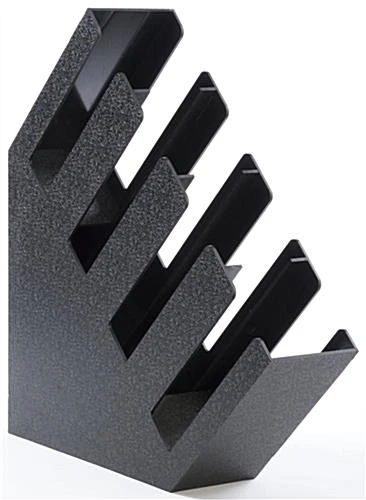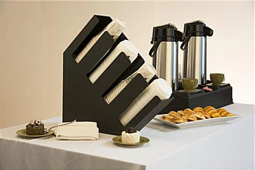 This cup and lid organizer is black with a triangular base that allows the display to tilt towards customers. Each coffee dispenser accessory has four compartments for storage of beverage supplies. The soft drink organizer is designed for countertop use. Try placing a coffee dispenser accessory near self-serve beverage stations, or use the display behind the counter as an organizational tool! Each holder features a textured black finish and durable construction which is ideal for use in restaurants, cafés, and more. Use the organizer as a storage solution, or make supplies available to customers at self-serve stations throughout an establishment!