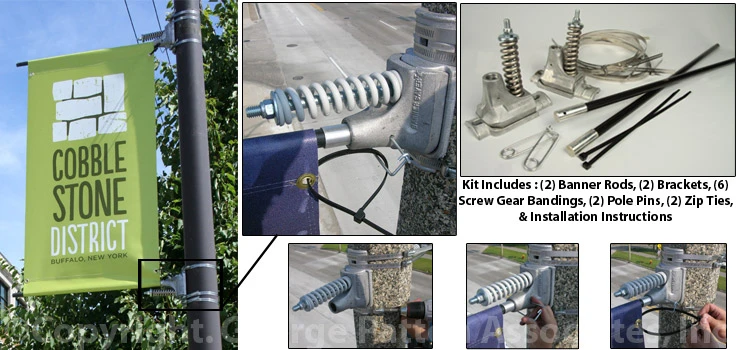 This pole mounting bracket hardware kit is designed for holding street flags. These banner accessories are for (1) 18″w flag. Each pole mounting bracket for outdoor use includes all the hardware needed for displaying a banner, customers just need to provide the actual flag. These lamppost accessories are made of highly durable cast aluminum with fiberglass banner poles. This street flag hardware kit is a pole mounting bracket that is rust resistant which is ideal for outdoor use. These sets come with (2) banner rods, (2) brackets, (6) screw gear bandings, (2) pole pins, (2) zip ties, & the installation instructions. Each street banner display is a pole mounting bracket that fits most standard lampposts. The bandings are long at 40″, which will fit a street light post up to 12.75″ in diameter. A pole mounting bracket that displays (1) flag is often used in town squares, on college campuses, in parking lots of a hospital, and in large shopping centers. These banner brackets are great for promoting special events, fairs, and welcoming the seasons. Each pole mounting bracket, known as a flag hardware kit, will work with vinyl or fabric banners. These lamppost flag hanging accessories are very eye-catching since they sit above eye level and patrons will easily see them when driving or walking and from a distance.