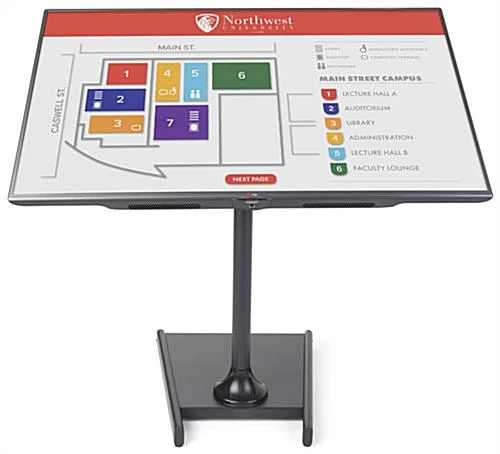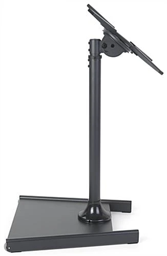 This flat screen digital lobby kiosk stand, also known as a slanted plasma mount, can be used to direct guests to the appropriate location. This office building signage is the ideal electronic communication tool for businesses in need of directing visitors. This tilting digital lobby kiosk stand allows users to slant screen at a good angle with a range of 69 degrees. This electronic tilted plasma stand has a hollow post to easily hide wires. This digital lobby kiosk stand weighs 82 lbs. for a sturdy fixture. This office building advertising stand has a steel frame to provide a stable and lasting display. This digital lobby kiosk stand is economically priced and a great deal for many businesses!