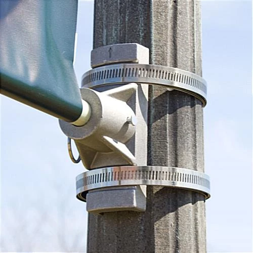 These banner brackets allow customers to mount street flags in many locations, and on many different types of poles. This set of hardware is engineered for compatibility with round and square light poles. The (4) screw gear bandings are 48-1/2″ long, allowing each banding to fit around lampposts with a diameter of up to 15-1/2″. To secure each bracket to a light pole, simply position a banding in the upper and lower channel of each bracket. Then, slide the end of each banding into the screw mechanism located on the opposite end. Once each screw gear banding is in position, push the screw mechanism flush against the binding and tighten with a screwdriver. This hardware does not have an “on-pole adjustment” feature. Each screw gear bandings must be loosened, and each bracket positioned to pull flags taut. Due to a simplified design, this set of banner mounting hardware sells at very affordable price points.