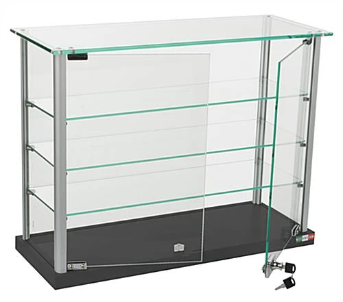 This countertop display case prevents patrons from fulfilling a self serve type of shopping experience. Rather, customers must request assistance before touching merchandise which is ideal for high priced, valuable, or breakable items. Lockable display case store fixtures can be conveniently positioned on a counter allowing products to be at eye level for browsing consumers. Two swing open tempered glass doors provide easy access when removing items for further review by patrons before making a sale. Additionally, if necessary, the three shelves are height adjustable and removable for added space and versatility when arranging a showcase. Each case with aluminum framing, black veneer base, and tempered glass canopy is compatible with any retail counter lay out.