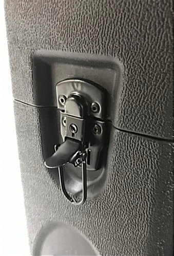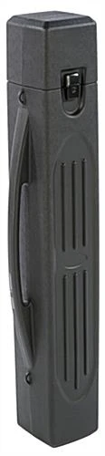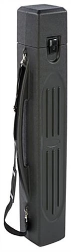 This banner stand case protects and transports your trade show graphics with ease and in a hassle free manner. Preserve expo materials with the portable carrying container, equipped with hinge locks and a set of two keys ensuring security for your expensive items while in transit. Each trade show case has a handle for easy transportation once inside a convention hall. Helping to free up your hands when moving extensive amounts of equipment, the portable carrying holder includes an adjustable shoulder strap for added efficiency. The case constructed from black plastic can hold up 22lbs.