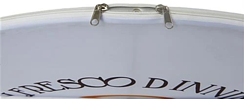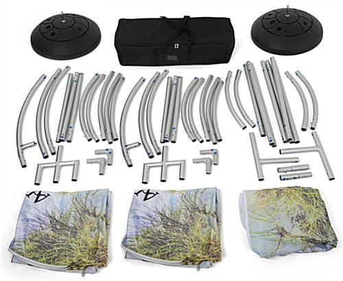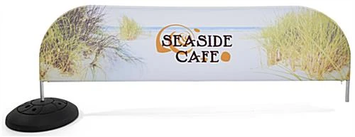 This outdoor fabric tube barricade feature is a custom printed display to attract passersby to community events, concerts, restaurants, and marathons. The two black plastic bases can be filled with either sand or water, providing a sturdy self-supporting base for the mushroom-style shape signage and barrier stand. This crowd control outdoor fabric tube barricade features custom printed graphics on polyester knit material for limitless branding creativity while withstanding sun and weather elements. Re-configure your display signage by utilizing the center prong and four cavities to create your ideal barrier arrangement for your event. An aluminum snap-tube design allows for a simple setup with minimal tools. The locking frame design with push pins provides a durable stand during high traffic restaurant hours or large gatherings. Our modular outdoor fabric tube barricade will entice passersby to your outside dinner service, concert, and festivals!