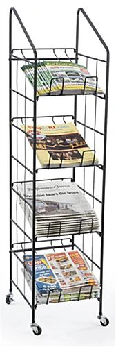 Tabloid Rack For Floor W/ Wheels, 4 Shelves, Fits Newspapers & Magazines – Black
