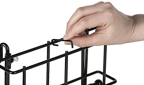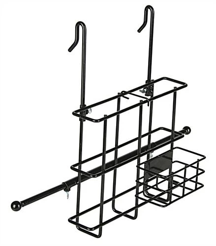 This black wire literature pocket for A-frame sign is a terrific attachment to bring your standard sidewalk display to the next level. Each brochure holder features an adjustable hanging bar and horizontal support bar, making this piece compatible with most sandwich boards. Simply hook the display literature pocket on to one of the A-frame’s side hinges – or double your exposure with a rack on each side of your sign. Use this brochure holder’s sliding divider to accommodate literature up to 8.5” x 11”, including magazines, catalogues, menus, flyers, and more. Constructed with a metal wire material, this literature pocket is sturdy enough to withstand high traffic areas, making it a great option for sidewalk signs, trade shows, schools, etc. To attach, make sure the length of the interior side of the sandwich board’s side hinge is at least 7″. Take advantage of these busy areas and throw your business cards into card holder, which is built right into front of the display rack.