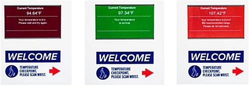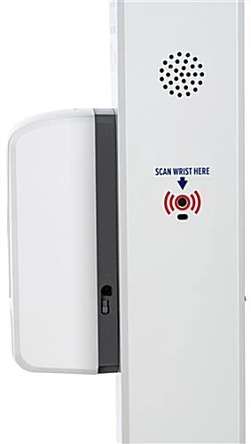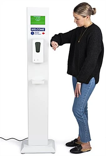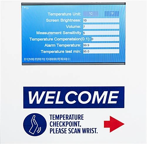 Our infrared body temperature wrist scanner will provide your business with a touch-free safety solution, so you can feel at ease knowing the well-being of your staff and visitors is protected. This floor-standing thermometer kiosk makes it easy to track the thermal level of each individual entering your facility while also conveniently providing them with hand sanitizer upon entry. The touchless gel dispenser is powered by four C-Cell batteries (not included). Each touch-free body temperature wrist scanner allows users to set a custom range from 91.4F to 109F to suit their specific business needs. This unit also has a 0.1-second response time and is accompanied by visual and audible prompts for added convenience. You can feel confident with each customer’s thermal reading, as each scan has a +/-0.5°F accuracy. This scanner and sanitizer meets ADA height and reach standards. This thermometer kiosk has overall dimensions of 63.5″ H x 16″ W x 11″ D, providing you with a sleek and non-obtrusive floor-standing design that will work with any office or store aesthetic. This touch-free body temperature scanner will bring comfort to any event venue, educational space, casino, and more, acting as a final safety protocol for areas where social distancing is not a practical option.
