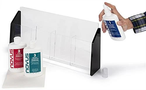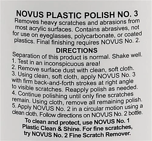 Our NOVUS complete plastic polish kit is designed to buff out both fine and heavy scratches and restore existing items to a brand new state for continuous use within your medical space, bar or restaurant, university, or hotel setting. This 5 piece bundle includes two microfiber polishing cloths along with three 8 ounce bottles of trusted NOVUS cleaners, each one with different properties to meet your specific product needs. The No. 1 Clean and Shine solution from your NOVUS complete plastic polish kit is also safe for glass, and leaves a lustrous grease-free shine while resisting dust and static without harsh chemicals. Liberally apply the No. 2 Fine Scratch Remover to your uncoated surfaces for quick removal of light damage, and also for color fade restoration after repeated use. The No. 3 Heavy Scratch Remover is intended to eliminate even heavier abrasions from products like protective acrylic shields and plexiglass windows, and should be used in conjunction with the other two solutions in the recommended order as stated on the included pamphlet. The two microfiber polishing cloths ensure that all you need to restore your existing items is included in this convenient and cost-effective bundle. Use this NOVUS complete plastic polish kit to keep your everyday products and surfaces looking new for the continued reassurance and trust of your patrons.