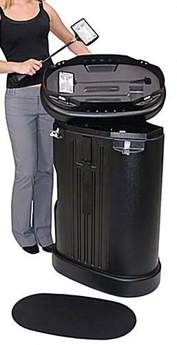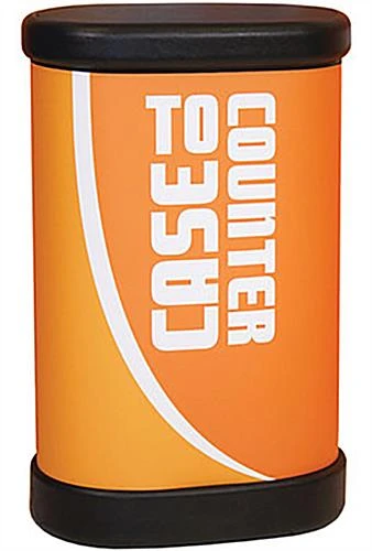 These trade show cases are sold with custom-printed graphics that have hook and loop attachments to wrap around the outside of the plastic container. The made-to-order prints are digitally printed based on your artwork. Simply download the templates and submit your designs during or shortly after checkout. These trade show cases are made from a hard blow molded plastic material that is sure to withstand frequent travel. A separate storage area in the lid is provided for keeping spotlights and other small accessories protected. Foam cubes prevent the lights from moving around during travel. These trade show cases are extremely portable as they are also equipped with wheels for effortless mobility regardless of how heavy a load may be. The hard plastic containers are extremely versatile as they can also be used as portable counters during an event. A countertop insert is even provided to create a smooth top surface on which product samples or other presentational supplies may be placed.