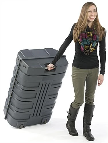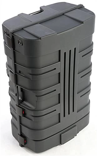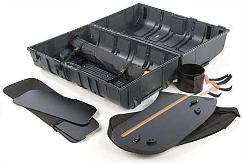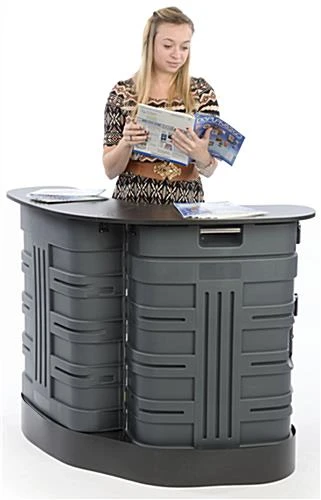 This podium shipping container, ideal for a trade show, easily transforms into a display counter in just minutes. Used as a travel case, each industrial design holder supplies a smart and durable storing solution for accessories and equipment during transport. Alternatively, this transformable shipping container can be opened and assembled as a counter. Trade show booths become complete units with a standalone display station to present marketing materials, offer samples, interact with attendees, and house supplies. Utilize the 4 interior shelves to store products and keep necessities readily available while out of sight. Once an expo comes to an end, simple breakdown the unit by removing the shelves and countertop, packing in the provided bags, lock within the shipping container, and cart your trade show materials away with ease!