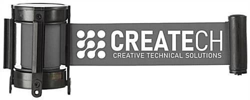 This is a gray custom stanchion belt with 1 color printing compatible with the QueuePole.Economy Series. Simply attach the 4 way adaptor to the post tops and secure with screws to begin configuring crowd control options. Available with single or double sided graphics, these retractable bands provide a 6.5′ area to showcase company logos, emblems, and messages. Silkscreen application is used on each nylon strap to create customizable branding while maintaining organization.