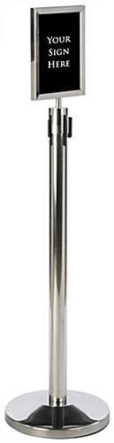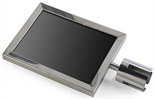 This 8.5” x 11”” stanchion frame is the perfect accessory to accommodate our RCCSTSPL01 crowd control system (sold separately). The metal sign holders exhibit posters which can be printed on standard sized paper from an office or home computer! The double sided stanchion frame features protective anti-glare inserts to prevent scratches and tears as well as to provide optimal readability for your message. The metal sign holder also includes a thick PVC backer which can be easily transformed to permanent signage by bringing the part to your local sign shop and having a graphic applied! Display posters with the stanchion frame to maintain an orderly crowd during large events or parties. Each portrait mounted sign topper is crafted from polished stainless steel for a sleek look and durability in high traffic locations!