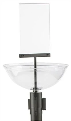 This dump bin stanchion topper is compatible only with the QueuePole.Economy series stanchions. The merchandising bowl has a 14” diameter and is 7” deep. Promote products using the 11” x 7” sign holder that is fixed in portrait orientation. Slide the topper over the cassette of the stanchion to assemble.