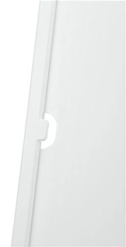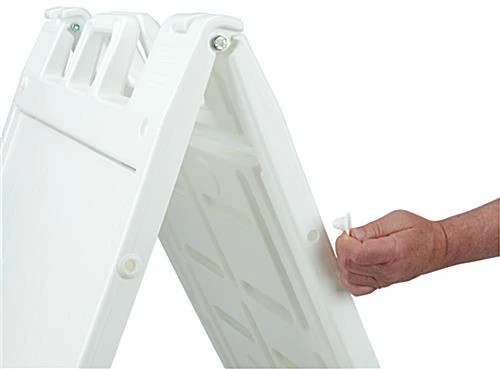 These outdoor signs are manufactured exclusively from polyethylene, a durable plastic, making them ideal for exterior use. Their durable construction ensures that the frames won’t rust or splinter over time, unlike wooden a-frames. These outdoor signs feature sleek, white coloring allowing messaging and colorful posters to stand out. These outdoor signs may be filled with sand for extra stability in windy weather. The hinges of this portable display lock and unlock for easy setup and transport. These outdoor signs feature a top handle for ease of transportation.