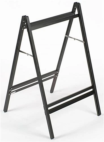 This sidewalk sign, also known as an A-frame, is fabricated in aluminum with a black finish for exterior use. The neutral coloring is the perfect frame for any advertisements. This sidewalk sign is made with durable materials for long term use. The rugged aluminum extrusion is perfect for outdoor and indoor displays. Your sign simply slides down into the channels and onto the ledge of the sidewalk sign at the bottom. This easy installation process allows for quick changes. Sidewalk sign user can simply add vinyl graphics or silk-screening to create custom signage. Advertisers are encouraged to get creative with their content.The sidewalk sign is double-sided for twice the exposure and passersby always notice these types of signs. People coming from either direction are sure to get the message. This sidewalk sign, a folding display, is a portable sign easily set up and stored away at your convenience.