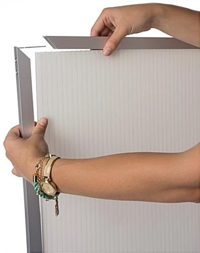 Change your sign stands in minutes! These signboard units, which are banner stands, can be put together as easily as 1-2-3! Once your signboard is designed, simply slide the Coroplast into the metal frame, attach the frame’s top bar, slide the frame onto the metal posts, and your sign display stand is complete. And with a portable signboard like this one, you can move and change the location of this display with ease. These signboards were designed with ease of use and frequent sign changes in mind.