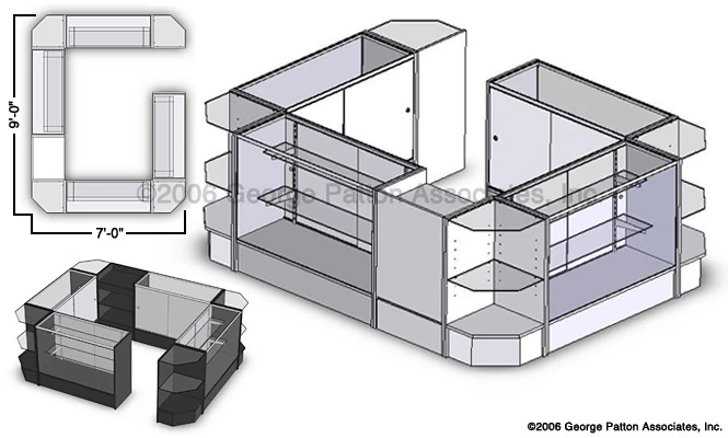 Economy Modular display cases are retail fixtures that give flexibility to a center aisle mall vendor or a large department store. The configuration shown above is relatively compact, yet allows a retailer to display a large quantity of merchandise. This set of modular display cases includes a single register stand, four corners, and four 48″w showcases. Please note: Our Economy series are manufactured with a low-pressure laminate, called melamine. This is a lesser grade of laminate than Formica™ type laminates used on kitchen counters and is more susceptible to knicks, dings and scratches than our deluxe series.