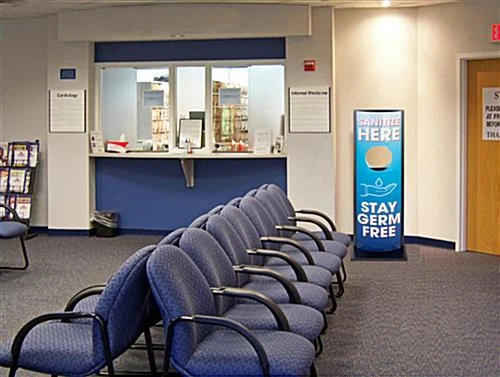 Our “Sanitize Here” touchless dispenser kiosk with double-sided pre-printed graphics is an innovative way to communicate public health messages. Our unique free-standing automatic station releases 1 mL of cleansing gel when the palm is placed in the center hole and can conveniently be accessed from both sides of the unit. This 49” tall “Sanitize Here” touchless dispenser has generic and vibrant pre-printed graphics that will help guide customers, guests, and employees to this essential hand hygiene service. Our automatic kiosk features two colorful acrylic lenses, motion sensors, and a built-in drip well, making it great for placement in banks, medical office waiting rooms and restaurant common areas. No expensive or exclusive replacement cartridges are needed for this station, as the refillable 1000 mL container uses your favorite free-pour gel cleanser. Place this battery-operated “Sanitize Here” touchless dispenser with clear and concise public health messaging on your retail establishment or office environment as a way to eliminate the spread of bacteria and germs from one another.