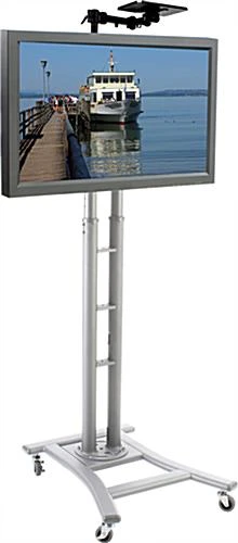 TV Stand W/ 8 Heights, Fits Monitors 32 To 70″, W/ Camera Shelf – Silver