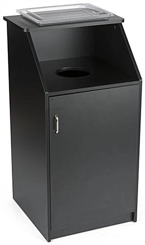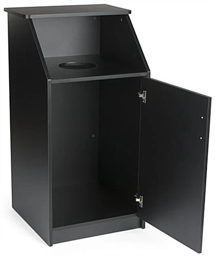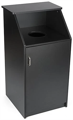 This waste receptacle enclosure features a top loading opening which conceals refuse and provides an area for customers to rest trays. The heavy-duty trash bin holds a 36 gallon barrel, excellent for recycling and disposing of garbage in chain eateries, food courts, cafeterias, and more. Our black, hinged waste receptacle enclosure is made of durable 18mm thick particle board, ensuring a stable design that will last for years to come. Effortlessly switch out the garbage or recycling bin using the swing-open front. This top loading refuse container with a hinged door has a sleek black melamine finish that will last for years to come in any hospitality setting. The smooth coating protects the trash bin from kitchen heat, moisture, staining, and more. This modern waste receptacle enclosure with a melamine finish is ideal for keeping refuse out of sight and maintaining a clean appearance in food courts, cafeterias, schools, and more.