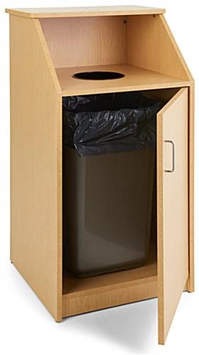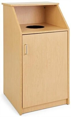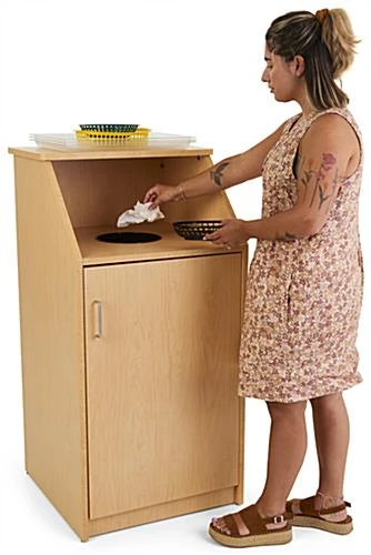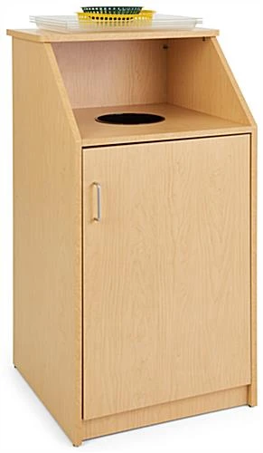 This restaurant trash receptacle features a top loading tray shelf which gives customers a place to store used platters and dishes when they throw away garbage at food courts and cafeterias. The heavy-duty fixture is made of particle board and includes a circle opening to dispose of waste quickly and easily. Our top loading maple restaurant trash receptacle also has a front hinged door, perfect for promptly replacing liners when needed. This USA-made container can hold one 36 gallon bin, an ideal size for recycling or garbage disposal. The maple hinged waste barrel has a sleek melamine coating, which protects against kitchen conditions such as heat and moisture. This finish also makes it effortless to clean at the end of each day. Use this melamine restaurant trash receptacle in food courts, chain eateries, cafeterias, and malls while keeping liners neat and out of sight from diners.