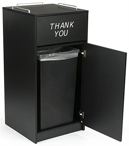 Featuring a tray top area with chrome bars, this “thank you” restaurant receptacle is perfect for eateries, cafeterias, and food courts. The swinging door features an engraved message to show appreciation to customers. Each wooden receptacle is capable of accommodating up to 36 gallon sized trash bins. Chrome handles make a 19” x 19” tray top area to prevent the platters from falling off the sides. Accommodate gallons of refuse or food waste in your eatery by utilizing this receptacle. The black finish looks great in various settings and hides unsightly garbage in style.