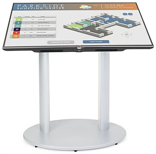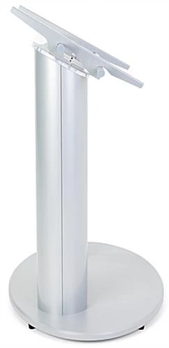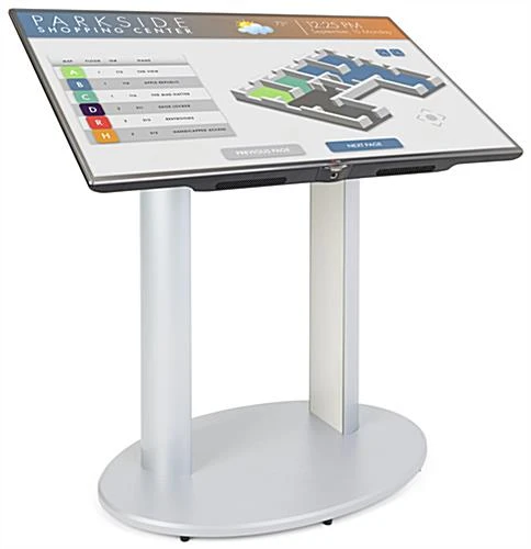 An interactive kiosk, screen stand has (6) rubber feet on the base of the display. These feet help prevent markings on the floor, as well as keep the stand stable while in place. A screen stand has a satin silver color to easily blend in with nearly all surroundings, and is made of durable materials to hold up well even in heavily trafficked locations. We ship this screen stand out assembled for ease of use, you only need to mount your monitor with simple tools!
