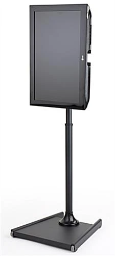 This height adjusting conference room tv stand, also known as an lcd mount, is certain to suit any table height. This lcd mounting post for an office can tilt up to 69 degrees. This office monitor mount, conference room tv stand that includes a tilting bracket allows users to adjust to the ideal viewing angle. This monitor kiosk has two wheels to move when desired. This conference room tv stand that has 8 set height adjustments allows users to position stand depending on the use. This office plasma or lcd screen mounting device includes a VESA bracket to fit most television mounting schematics. This conference room tv stand is ideal for placing at the end of a meeting table. This fixture blends in nicely in an office environment.