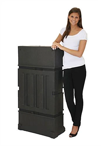 Enhance the effectiveness of a promotional visual with an exhibition display unit! The back wall includes (1) center panel, (3) accent graphic panes, and (4) rigid wing accents for a special effect to the arrangement. A mobile display unit can be easily assembled into an appealing pop up display and quickly disassembled into an OCH2 carrying case with wheels for a portable trade show booth. A larger display with a 118” wide setting and 102” tall makes this wall easily seen by onlookers to successfully promote company products and services at busy events. (2) LED floodlights illuminate the custom printed graphic or text of your choice making the display unit a bright and appealing pop up banner stand. Pair this backdrop with some trade show fixtures available on this site such as TV stands, iPad mounts, and portable counters to create a one of a kind portable trade show kit!