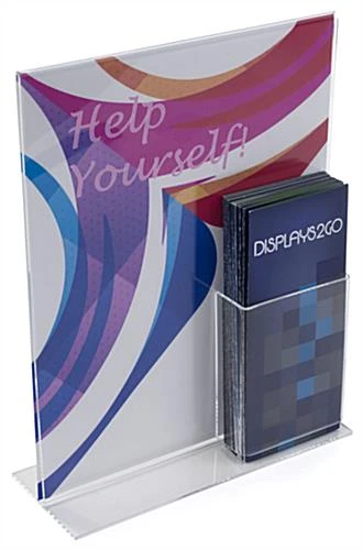 Sign Frame – This sign frame with acrylic brochure display is offered in the bottom/side load “T” style. The graphic display holds an 11″ wide x 14″ high insert. Each unit features an attached brochure holder in the bottom right corner that will fit standard 4″ wide literature. The pocket measures 1.75″ deep, so it can hold a nice stack of publications. The frame is great as a countertop display for any location!
