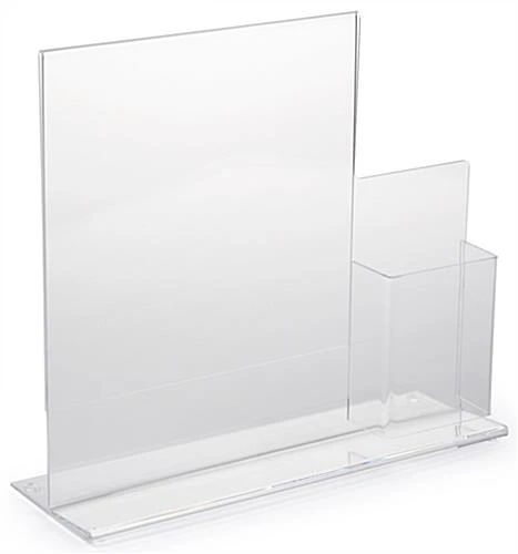 11 x 14 Sign Frame with Brochure Holder- This “T” style sign frame with literature holder is great as a countertop acrylic display. This acrylic display has a graphic area of 11″ wide x 14″ high with an attached brochure holder for 4″ wide literature. The pocket is 1.75″ deep by 5.5″ high. These acrylic display stands make great retail display presentations. We also carry this product featuring a rich black base.