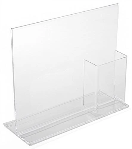 Sign Frame with Brochure Attachment- This sign stand has an acrylic literature holder pocket. This allows for an unobstructed view of your 11″ by 13″ display graphics with attached brochure holder pocket for standard 4″ wide brochures. This sign frame allows you to use a printed graphic that is 13″ wide by 11″ high and insert a solid color on the right side behind the pocket. The brochure pocket is 1.75″ deep by 5.5″ high. This sign frame is great as a countertop display!