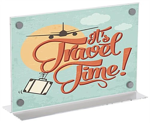 A classic design ensures years of use, and this 17” x 11” acrylic table sign is no exception. The T-style construction offers a signage holder suitable for any business or marketplace. Showcase brand promotions, restaurant specials or establishment notices with a landscape table sign. Print your own custom designs and load into the signage holder at will by unscrewing the silver standoffs. Each table sign provides a versatile option to update marketplace displays as needed while demands change. The clear frame provides a timeless T-style unit for every occasion.
