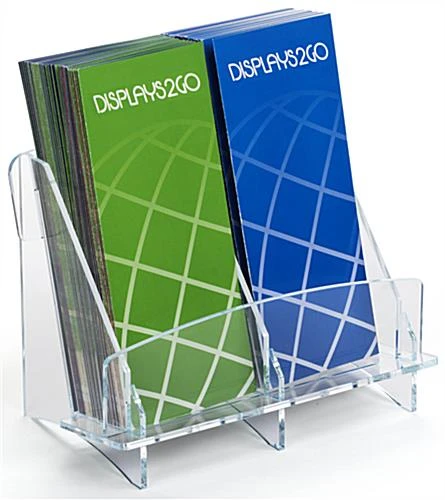 Showcase twice the amount of materials with this double brochure holder that features a side by side single pocket design. Each portable literature stand is meant for countertop placement and includes a knock down function. When not in use, this clear acrylic brochure holder can be broken down to reduce the amount of space allowing for flat shipping or storing. Display a variety of tri fold literature in the side by side pockets with a full view design, ensuring the entirely of your materials are being seen through the translucent front panel. A slant back offers a more comfortable view of the brochure holder when placed on a trade show counter or reception desk. Assembly couldn’t be easier, simply slide the appropriate panels into the corresponding grooves like a puzzle. With a knock down design, clear acrylic construction, and easy no tool assembly this portable literature stand is an ideal option regardless of the industry.