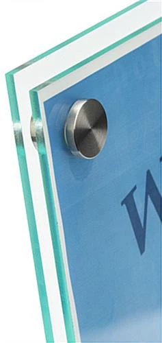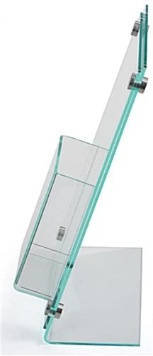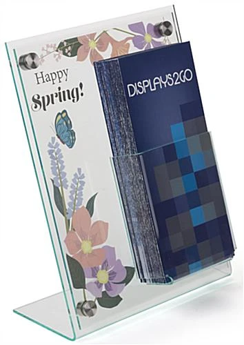 Step up your marketing game to showcase custom materials in one place with this slanted sign holder with brochure display. Featuring an off centered acrylic pocket, suitable for 4” x 9” pamphlets, strategically coordinate your signage to be presented behind the plastic front panel. Clear and frosted printable film sheets are included with the countertop sign holder, allowing you to create and produce a variety of custom 8.5” x 11” posters. Simply remove the 4 stainless steel standoffs to swap out signage as your events and seasons change. With an open top design patrons are allowed easy access to grab your literature, while the translucent front offers a full view clear acrylic pocket. The angled construction of each sign holder provides a comfortable viewing position for any countertop surface to help heighten patron interest.