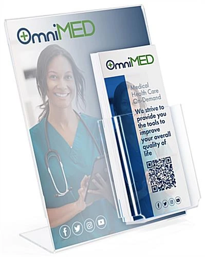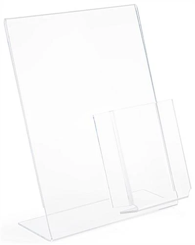 Each acrylic sign display features a brochure holder pocket that is 1.5″ deep and 5.5″ high with an inside width of 4.125″. Shoppers that need a frame with an unobstructed full 8.5″ x 11″ message area, see the related items. This acrylic sign display can also be customized with a silkscreen logo or slogan on the pocket. Please see the minimum order requirements for more details.