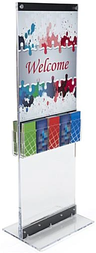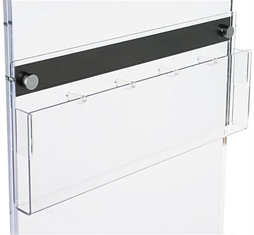 Use this brochure holder for FSPH poster stand series to expand your literature material storage space. Compatible with the clear acrylic sign frame, the silver standoffs from the complete unit is used to secure the add-on in place. Removable pocket dividers allow for more versatility and freedom with your material sizes. Clear construction provides a full view of the handouts placed within the 5 slots.