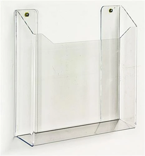 This wall mount transparent newspaper rack helps patrons locate the paper at a glance. Add a few newspaper racks to display your entire selection. A single pocket journal holder, this newspaper display rack is a great addition to hotel lobbies, coffee shops and magazine stands. This display, also known as a newspaper rack, is also found in airports, public libraries, and markets. Simple and efficient, this newspaper display provides an elegant way to advertise your periodicals. This display rack has two (2) predrilled holes for easy mounting. We include the plastic wall anchors and screws to mount the rack to the wall. This paper display racks holds periodicals up to 13-3/8″w.