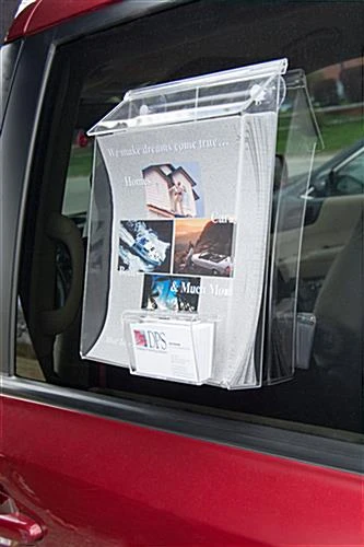 Is your company in need of a cheap on the go outdoor car brochure holder? If so, then buy this advertising tool today! The acrylic business card display comes with (2) suctions cups for easily sticking to any window or glass surface. Each clear outdoor brochure holder can fit literature up to 8.5”w x 11”h. These fixtures also come with a business card display that adheres to the front of the unit. This brochure holder has a lid that snaps shut when released keeping the pamphlets dry during inclement weather. A clear literature display can be secured to windows in seconds and comes down just as quickly which is ideal for traveling companies.